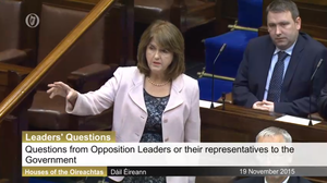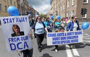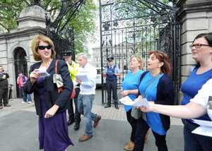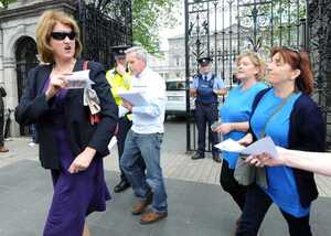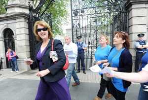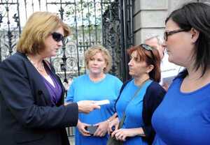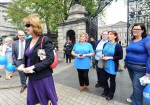 The DCA Warriors, a protest group to push the government to pay a Domiciliary Care Allowance to parents of children with special needs, confront Minister for Social Protection Joan Burton outside the Dail this afternoon.