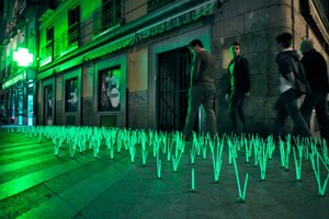 Anonymous Madrid-based art group LuzInterruptus draws public attention to social and environmental issues in the city (decommissioned public swimming pools, nuclear power, shrinking green space, abandoned sites, etc) by creating ‘light interventions’ (not to be confused with ‘heavy interventions’) – temporary LED installations. They say: