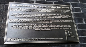 Lower Abbey Street, Dublin, was where the tricolor was first revealed to the nation. There is a plaque to tell you the story but no Tricolour. The plaque says the unveiling of the national flag took place in the music hall at this location on Lower Abbey street on 15th April 1858.