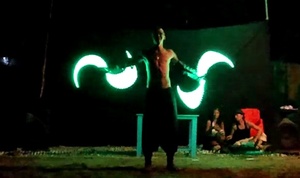 Dancer ‘Maugley’ performing at last year’s Indian Juggling Convention at Ashwem Beach, North Goa with the perfect addition to any night-time hoofer’s arsenal: a homemade LED buugeng.