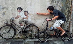 Artist Ernest Zacharevic’s paintings in Georgetown, Malaysia featuring mischievous kids interacting with real-life objects. The bicycle piece in particular has become a huge tourist draw, with people encouraged to take their own creative photos of the scene.