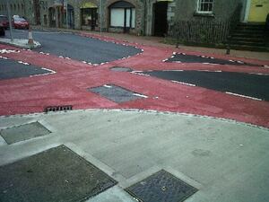 Have bicycles now got right of way to swerve across busy traffic lanes? This campaign of haphazard cycle lanery in Dundalk would be funny if it wasn’t so bloody dangerous. Two lane streets are being made single lane (with double cycle lanes enclosed with barriers) and nobody knows who’s got right of way any more.