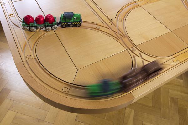UK company TrackTile makes dining tables from flippable tiles with grooved tracks for little battery powered Brio trains on one side.