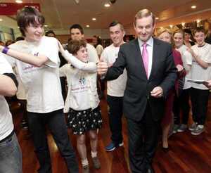 Enda Kenny and Frances Fitzgerald doing a conga with ‘the future’ at a Comhairle na nOg party at Croke Park, Dublin, earlier.