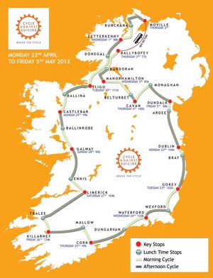 This a is new initiative called Cycle Against Suicide. A 1,400km 14 day Cycle Against Suicide. Travelling all around Ireland. Starting in Dublin on the 22nd of April. Take part in one or more legs (approx 100km each). Cost is €40 for jersey and insurance regardless of how many sections you do.