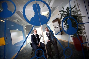 Richard Bruton (right) and Facebook ‘suit’ Gareth Lambe announcing 100 new jobs to fill a “range of functions” at Facebook Ireland.