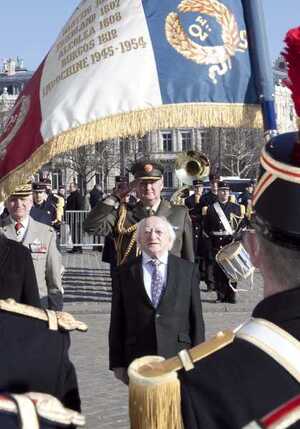 President Higgins, in Paris with from top: French President François Hollande, and with Irish generals at a wreath laying ceremony at the Arc de Triomphe .