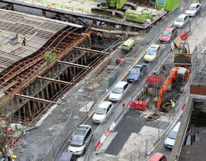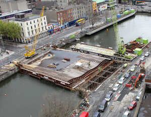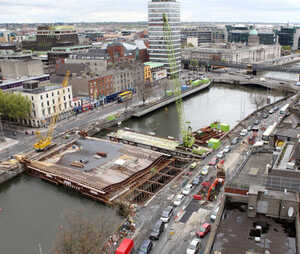 Views from the roof of O Connell Bridge House on ongoing building works of the new Marlborough street Bridge in Dublin which will connect the Green and Red luas lines when complete.