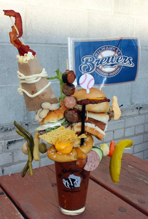 A ‘Bloody Mary Extreme’ garnished with bacon, popcorn, pickles, cheeseburger, pretzel, hotdog, baby corn, green beans, sausage, peanuts, nachos, cheese curds and ‘pure mouthal delight’, available for an astounding $5 at O’Davey’s Pub, Fond du Lac, Wisconsin.