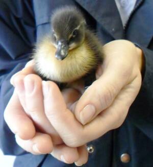 Shane a baby duckling was collected yesterday in the city centre. Shane’s mom was an unusual black and white mallard duck as opposed to the regular brown kind. The mother duck did a silly thing and nested in an enclosed yard where she could not walk her young back to the park. We presume the other ducklings did not make it as she was only left with one.