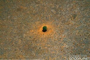 An aerial photo by Yann Arthus Bertrand of an acacia tree in Tsavo East National Park in Kenya – a rare source of food and shade in the thorny savanna – frequented by all manner of wild animals, and to which all trails lead.