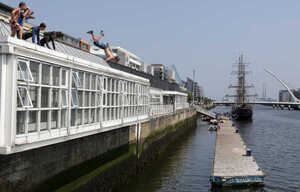 Scamps, tykes and wet-suited ‘messers’ leaping into the Liffey. in Dublin city this afternoon.