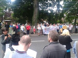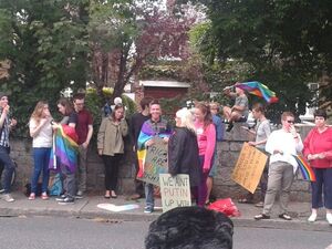 Anti gay law protestors outside the Russian Embassy, Orwell Road, Rathgar, Dublin, this evening.