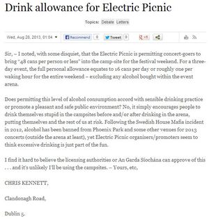 ‘One Can Per Waking Hour’ Admin at 12:41 pm August 28, 2013 Shrewd observer or temperance zealot? YOU decide. Drink allowance for Electric Picnic (Irish Times letters) FacebookTwitterPinterestSponsored Link Related posts: Electric Picnic: The Fans The Cure Fella The Picnic: A Veteran Writes To Get You In The Mood
