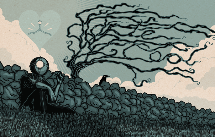 This character, Robohead, has been my mascot for about 8 years now. I drew him first when I got my first proper illustration job in London and he’s been with me ever since. Freud or Jung would probably have a field day on what he means. But in this he’s sitting in the wilds of Clare (which he, I mean I (we), love) thinking about how much he misses Dublin – because I do. I was born there, went to school there, all my friends are there and my brothers… I do miss it. But I love Clare…”