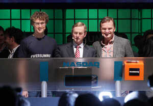 (From left: Web Summit founder Paddy Cosgrave, Enda Kenny and Bruce Aust of NASDAQ at the ringing of the New York stock exchange bell yesterday in the RDS, Ballsbridge, Dublin)