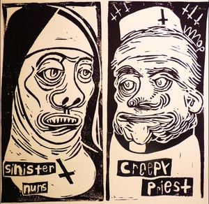 I have hand made lino prints on coloured paper for sale at 8 euros each for a single, 13 euros for a set of two and 16 for a triple set plus postage. That means for about a tenner you could have an off-beat and unique gift to truly surprise that special little weirdo in your life…