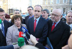 Fianna Fail leader Micheál Martin (above centre), Sinn Féin’s Caoimhghín Ó Caoláin (right) and Independent TDs Catherine Murphy (left) and Roisin Shorthall explain why they walked from the Dail this morning.