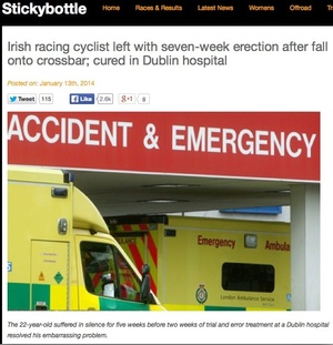 Lance Strong Arm Admin at 11:55 am January 14, 2014 Yikes. Just a case of cycling priapism. Nothing to see here. Irish racing cyclist left with seven-week erection after fall onto crossbar; cured in Dublin hospital (StickyBottle) FacebookTwitterPinterestSponsored Link