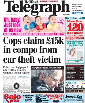 De Tuesday Papers Admin at 10:51 pm January 20, 2014 More to follow. Covers to broadsheet@broadsheet.ie Thanks Killian Woods, Colin McGann, Enda Cunningham, Brian Oliver and Joe Donnelly. FacebookTwitterPinterestSponsored Link Related posts: De Saturday Papers De Friday Papers De Friday Papers De Friday Papers
