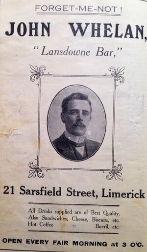 Advert for John Whelan’s Bar, Sarsfield Street, Limerick, 1914.