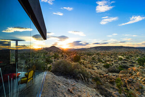 Designed by Marc Atlan and Oller and Pejic architects, this low profile house in the spectacular terrain of Joshua Tree National Park, California, finished in midnight quartz, high-gloss anthracite, darkened steel with a black tiled swimming pool and vast glass panels looks like some class of experimental stealth technology crouched alongside a rock formation.