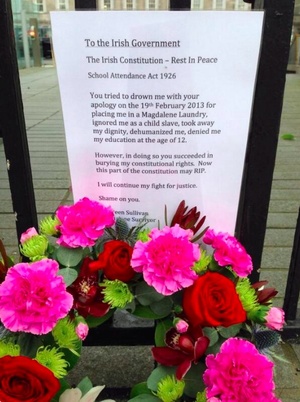 A letter and wreath left by Maureen Sullivan at Leinster House, Kildare Street, Dublin this afternoon.