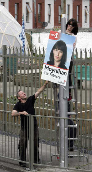 Scenes around government buildings, Merrion Street, Dublin this afternoon as campaigners including Labour Party Anti-Water Tax Party worker Goda Akuockaite (top) and Labour’s Rebecca Moynihan prepare for the local and European elections..