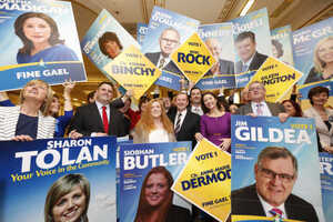 Enda Kenny (centre) with Fine Gael candidates for Local Election 2014 in the Shelbourne Hotel, Dublin.