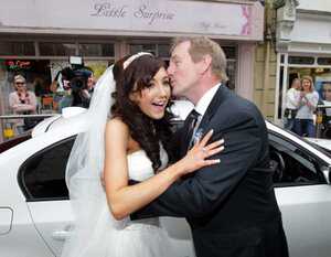 An Taoiseach Enda Kenny with newlywed bride Maria Ryan while canvassing in Carlow Town with Fine Gael MEP Candidate for Ireland South, Simon Harris TD.
