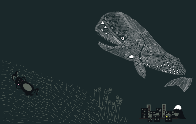 “Is a whale floating in the sky not a clear enough metaphor?! I suppose not, well one of my favourite things to do in summer is lie outside and watch the stars, so I decided it would be fun to draw a whale breathing out all the stars into the night sky..then I thought…you know what this whale needs lots and lots of DETAIL! (I do like detail) Then I thought…this would be better if it moved so I turned it into a .GIF. The End.”