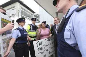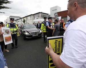 Protesters against water charges demonstrate as Enda Kenny leaves the opening of a new day hospital at St Josephs Hospital in Raheny Dublin this afternoon.