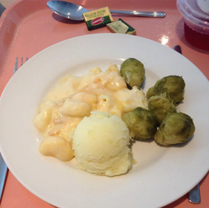 Is that macaroni cheese with a scoop of spud and some brussels sprouts?