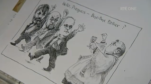 Her illustration – of the then three Government party leaders, Prionsias De Rossa, of Democratic Left; Ruairi Quinn, of Labour; and John Bruton, of Fine Gael, waving goodbye to a priest who appears to be giving out communion – accompanied an article in the Sunday Independent about the divorce referendum.