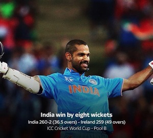You have it there Mikey. Ireland were all out after 49 overs with a total of 259 runs. India passed that total with 260 runs for 2 wickets after 36.5 overs (6 balls in an over so the hit the 260 on the 5th ball in the 36th over) meaning they had 13.1 overs and 8 wickets (of the 10 required to get a team all out) to spare.
