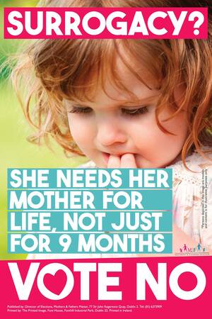 I didn’t know there was a referendum about Surrogacy coming up. Why did no one tell me about that? The Marriage referendum has nothing to do with Surrogacy as far as I can see. So these posters need to be taken down and can be used if and when we have a referendum about surrogacy.