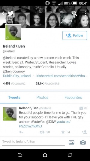 See Breda O’Brien’s son Ben Conroy has taken over the @Ireland twitter account this week after Dil Wickramsinge had it. Pretty funny to see lots of pro – gay tweets with his photo beside them. People will be retweeting Dil’s @ireland tweets all week.