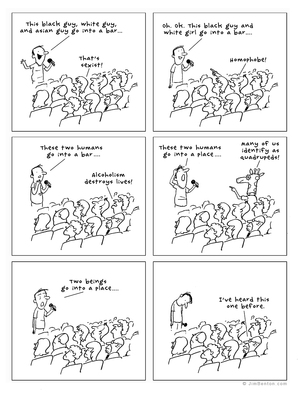 Isn’t it so ironic that this unfunny stand-up ‘comedian’ is reinforcing PC tyranny, by selecting token examples? He’s a conformist who is part of the New Establishment.