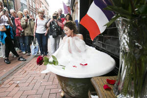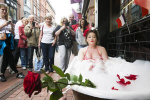 Polished chanteuse Derby Browne celebrates Bastille Day in the traditional manner: with a bubble bath while singing Edit Piaf [accompanied by accordionist Marta Siermantowska].