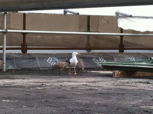 A Common Gull nested on the roof of the Bank of Ireland on Baggott Street {Dublin 2] in May. [The] Chicks [have] hatched and are running around demolition works and crane lifts….Nobody killed.