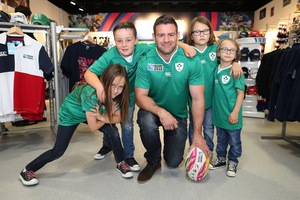 Tight haircut Fergus McFadden and rugby-loving tykes celebrating the arrival of Ireland’s tightest, greenest and most ‘tech-laden’ jersey to date at the country’s only official Rugby World Cup 2015 store in The Loop at Dublin Airport.