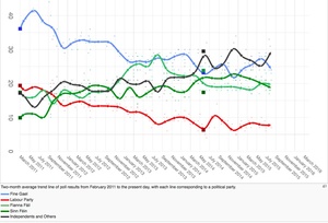 More interesting from the graphs shown is that since the start of 2015 (approx) Sinn Fein support is in anti-phase to that Labour & Fine Gael. When their support go down (govt loses support) Sinn Fein gains and vice-versa. The support for Independents/Fianna Fail appears to be decoupled from that of the govt parties. Sinn Fein would appear to be the real opposition already.