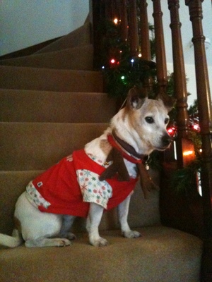 Here’s Dot, failing to wear her antlers properly, but figuring she has her geansaí Nollaig on so we should cut her some slack.
