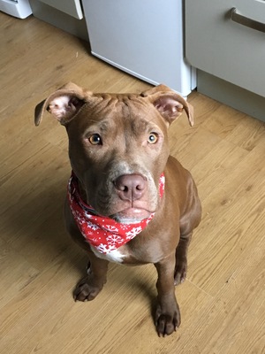 Trixie the Pit [Bull] is dressed and ready for her first Xmas…