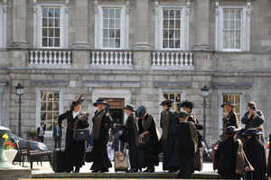 Cobh Animation Team (‘Bringing the women of Ireland’s past to life’) dressed in 1916-era fashions at Leinster House, Kildare Street, Dublin 2.