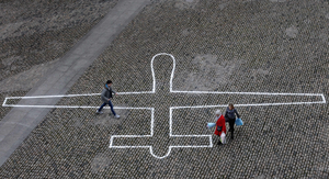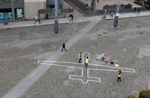 Many military drones fly higher than 30,000 feet, where they often operate undetected either for surveillance, or for launching missiles at remote targets. This increasingly ubiquitous but stealthy tool of modern warfare is all but unseen, and the artist combats this by marking out the shadow of the drone in urban settings.