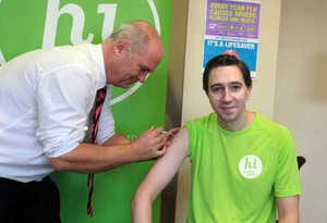 Fine Gael Minister Simon Harris receives the seasonal flu vaccine from Chief Medical Officer Dr Tony Holohan today to highlight the importance of people in at-risk groups getting vaccinated against influenza.