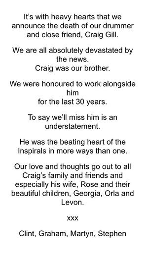 Inspiral Carpets sticksman Craig Gill, passing away today at age 44.