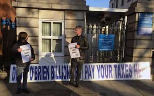 People Before Profit protestors outside the Four Courts urging Mr O’Brien to move back home from his tax exile in Malta.