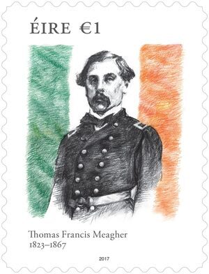 Designed by Dublin design studio WorkGroup, the stamp is based on a portrait of Meagher, by Charles, the stamp and a very collectable First Day Cover (FDC) are available from main post offices, at the stamp counters at Dublin’s GPO or online (at link below)
